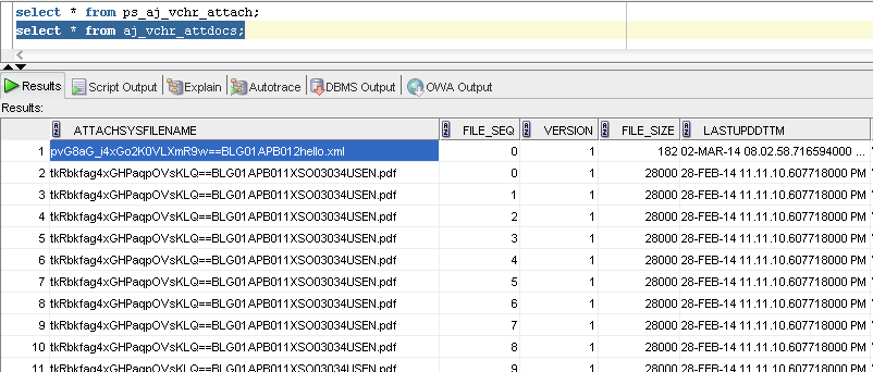 Note 1: The delivered process has split the file into smaller pieces and stored each piece as a separate record in the storage table AJ_VCHR_ATTDOCS. When the file is retrieved using VIEW button, these pieces will be added together by peoplesoft before presenting the file to you.