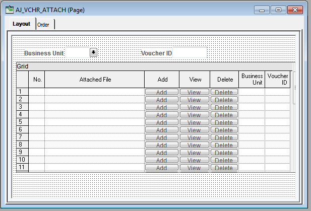 The fields Business_Unit and Voucher_ID are invisible. The fields SEQ_NUM and ATTACHUSERFILE are display only. The fields ATTACHADD, ATTACHVIEW, and ATTACHDELETE are pushbuttons.