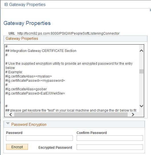 Let us define Integration Gateway Keystore password. From the PeopleSoft Node Configuration page, click the Advanced Properties Page link. The Gateway Properties page appears.