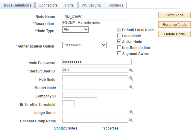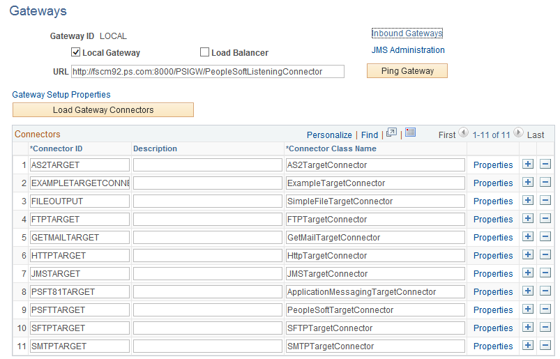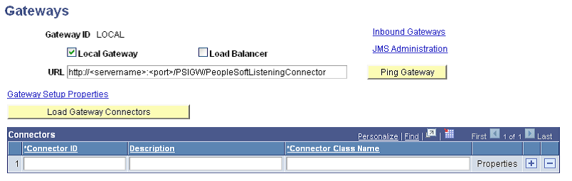 The Gateway Default Application Server section is where you define the application server to process integrations if inbound integrations do not specify a target node. The PeopleSoft Nodes section is where you register PeopleSoft nodes that will handle integrations.