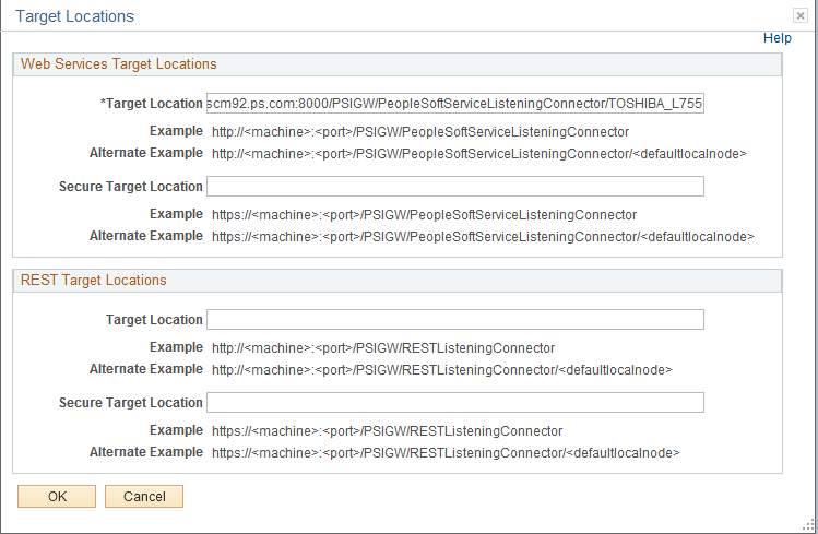 Let us define the Target Locations. Target locations are URLs that PeopleSoft Integration Broker uses to build and validate XML message schemas, export WSDL documents, and as the SOAP endpoint. To access the page, click the ‘Set Target Locations’ link on the Service Configuration page. The Target Locations page provides examples of the format to enter for the target location.